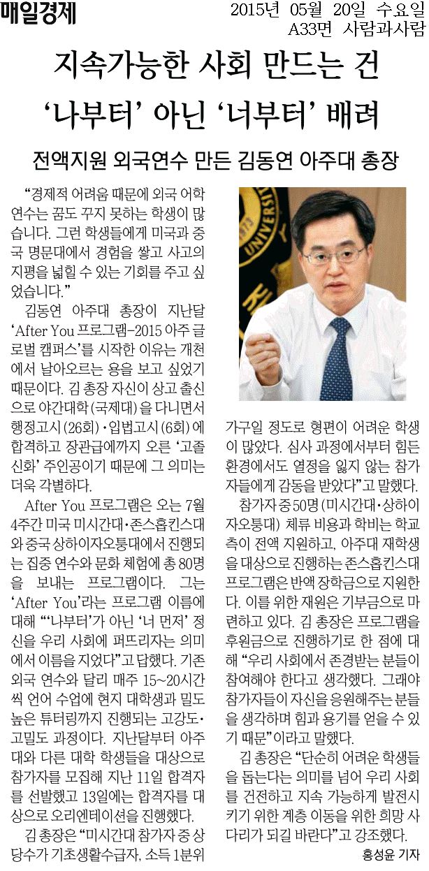 평생교육원 주최로 27일 교내 종합관 강당에서 열린 수원시 학부모를 위한 자녀교육 토크콘서트가 약 800명이 참석한 가운데 성황리에 마무리됐다. 행사는 수원시, 수원교육지원청, 아이엠스쿨 등의 후원했다. 특강은 ▲ 김미경 대표(더블유 인사이츠)의 ‘자녀의 성공, 엄마의 대화법에 달려있다’ ▲ 윤대현 교수(서울대 정신의학과)의 ‘자녀의 성공, 마음 공감력에 달려있다’ ▲ 김승 교수(한국창작종합대학)의 ‘자녀의 성공, 공부습관에 달려있다’를 주제로 각각 진행됐다. 특강과는 별도로 세명의 강사들과 박광온 영통구 국회의원이 ‘자녀의 성공적인 교육방법’이라는 주제로 토크콘서트를 가졌다. 강당 외부에서는 학부모 유형검사, 캘리그라피 체험, 메시지 나무 만들기, 자녀교육 고민 리플달기, 내 아이의 강점 재능 찾기, 습관형성 프로젝트 등 자녀교육 체험부스 활동이 진행됐다.