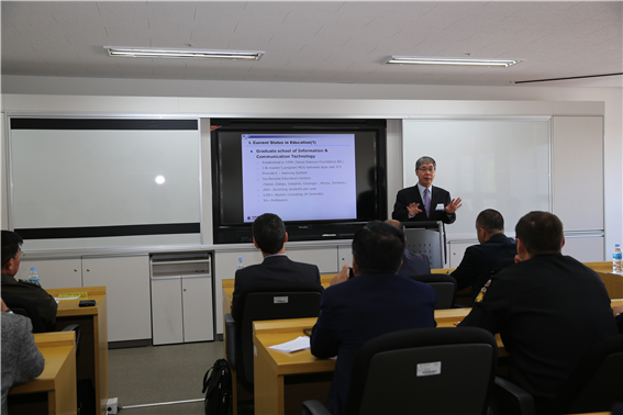 정보통신대학원(원장 김동윤)은 주한 외국공관에 근무하는 무관 초청행사를 22일 종합관에서 가졌다. 행사에는 러시아, 캐나다, 사우디아라비아 등 13개국 14명의 무관들이 참석했다. 행사는 정보통신대학의 국방관련 연구, 교육활동을 소개하고, 향후협력 방안을 모색할 목적으로 마련됐다. 방문단은 우리학교 정보통신대학원을 방문해 군관련 연구, 교육활동을 소개받은 뒤, 오후에는 삼성이노베이션뮤지엄과 LIG넥스원 등을 견학했다. 김동윤 원장은 “국방관련 정보들을 서로 교환하기 위해 마련했다, 이같은 교류의 장이 향후 C4I(전술지휘통제자동화체계), NCW(네트워크중심전), IT와 관련된 교육프로그램을 유치하고, 이를 바탕으로 무기체계, 소프트웨어 등을 수출할 수 있는 가능성을 높이는데 기여하길 바란다.”고 말했다.