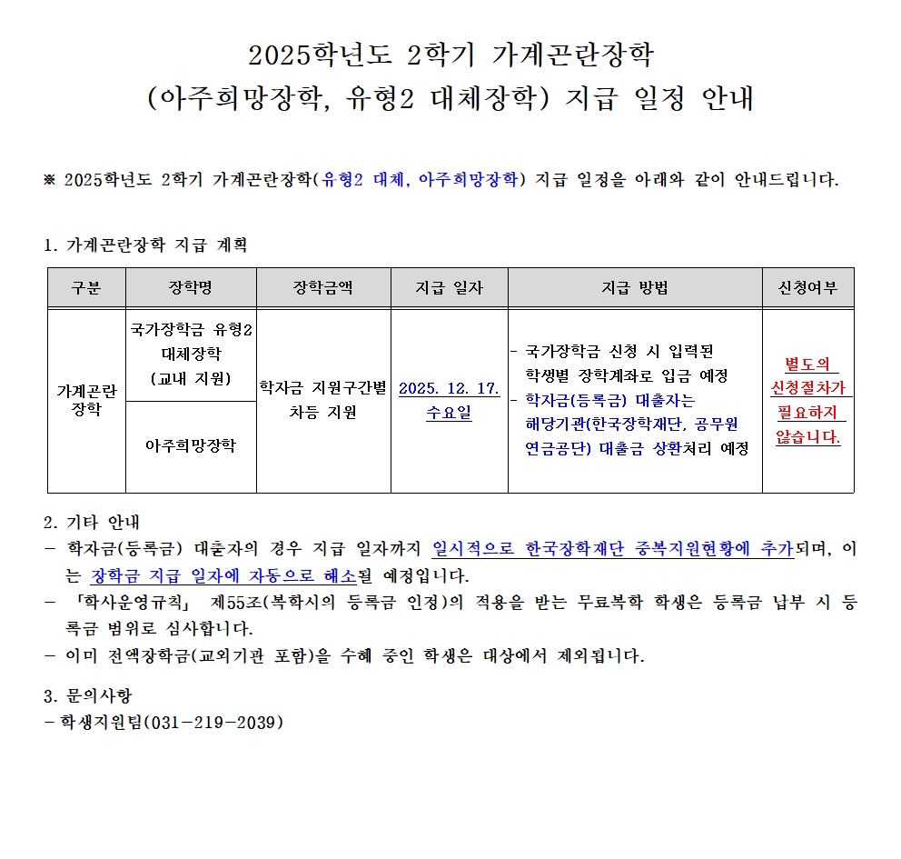 [장학] 2025학년도 2학기 가계곤란장학(아주희망장학, 유형2 대체장학) 지급 일정 안내