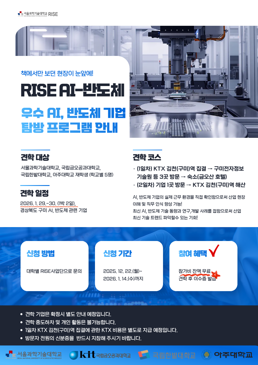 [비교과] (재공지) [RISE] 2025 RISE AI-반도체 우수 AI, 반도체 기업 탐방 프로그램 교육생 모집(무료) (~1/14(수)까지)