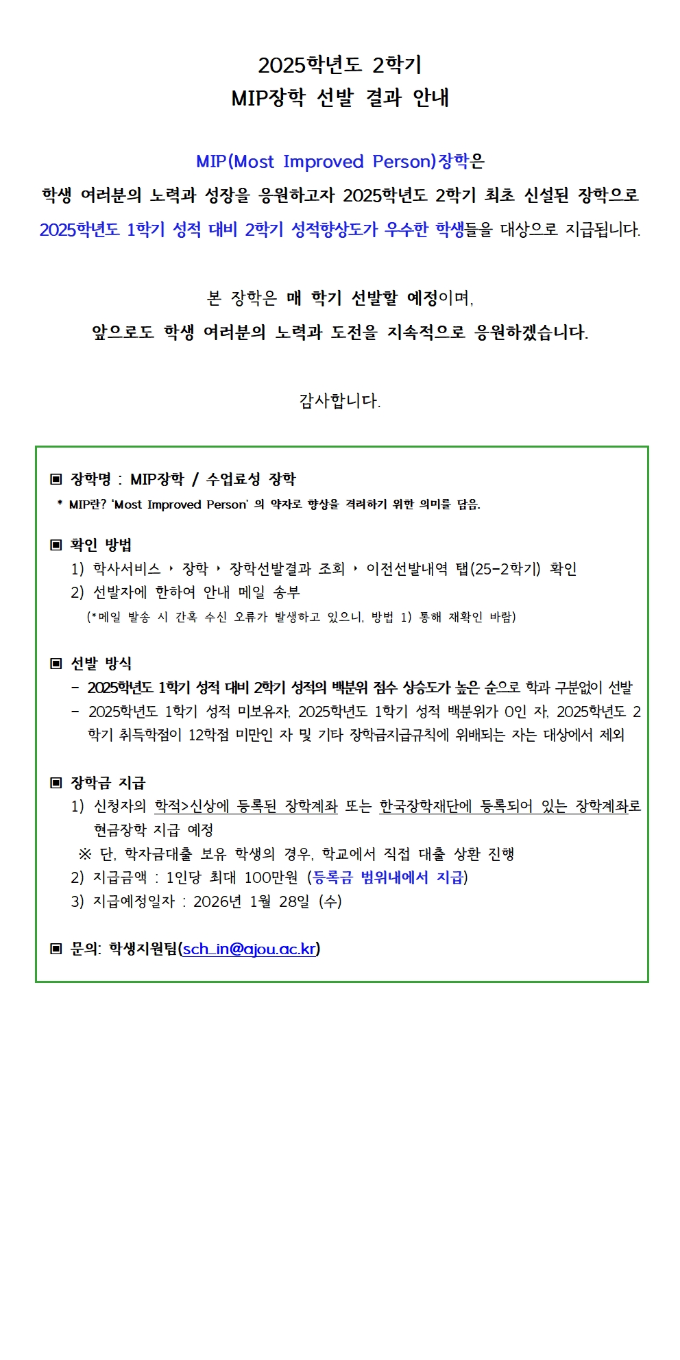 [장학] [학생지원팀] 2025학년도 2학기 MIP장학 선발 결과 안내