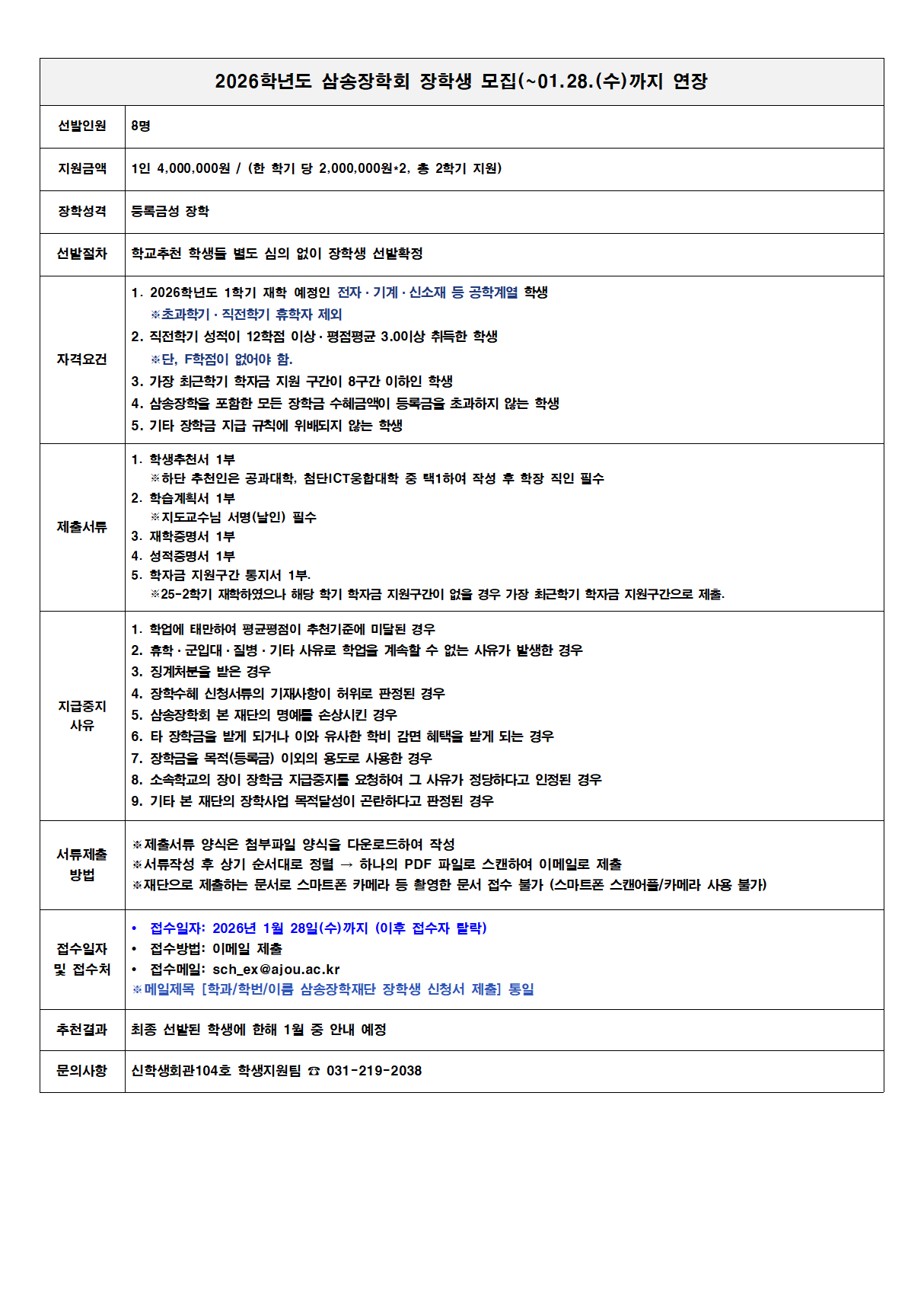 [장학] [교외장학] 2026학년도 삼송장학회 장학생 모집 공고 연장(~01.28.(수)까지)