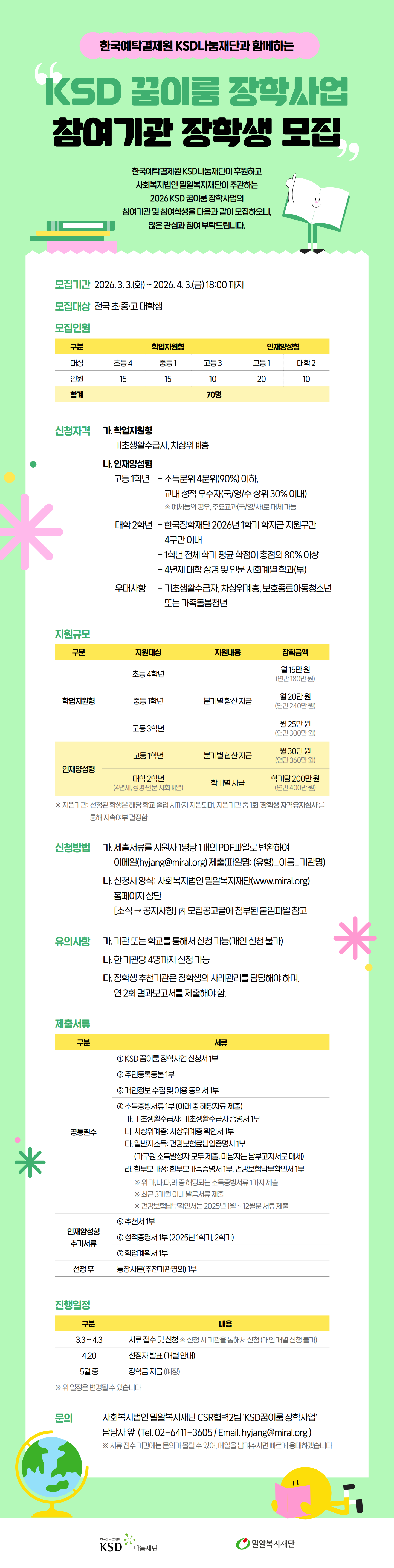 [장학] [교외장학] KSD 꿈이룸 장학사업 참여기관 장학생 모집 공고 (~03.27.(금)까지)