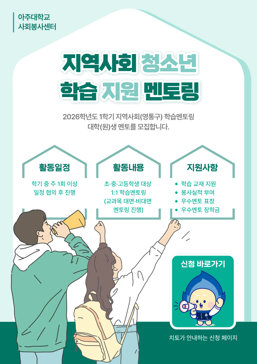 첨부파일의 멘토 신청서를 작성하여 사회봉사센터 메일(svc@ajou.ac.kr)로 제출해 주시기 바랍니다.