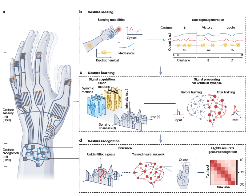 연구팀은 리뷰 논문에서 제안 플랫폼의 세부 구성을 구체적으로 제시했다. 우선 ▲제스처 센서는 손가락 관절, 근육, 표면 근전도, 광학적 변화 등 다양한 생체 신호를 높은 감도와 빠른 응답 속도로 포착한다. ▲뉴로모픽 시냅스 소자는 가소성(plasticity)을 조절해 반복되는 제스처 패턴을 학습·기억할 수 있도록 하고 ▲인공지능 인식 유닛은 CNN, RNN, 리저버 컴퓨팅 등 알고리즘을 적용해 정적·동적 동작을 실시간으로 분류·해석한다.